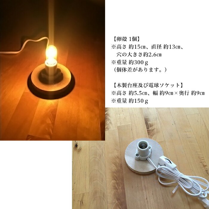 ) ・木製台座及び電球ソケット ※高さ 約5.5cm、幅 約9cm×奥行 約9cm ※重量 約150g 産地名 埼玉県美里町産 発送期日 入金確認から1週間〜1か月程度 詳細 埼玉県の厳しい暑さ・寒さを乗り越えたブリーダーのダチョウが1羽につき年間50個程度しか産まない貴重な卵を利用してエッグランプを作りました。
