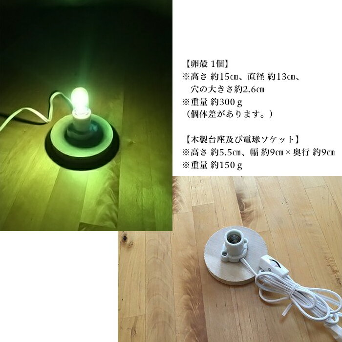 ) ・木製台座及び電球ソケット ※高さ 約5.5cm、幅 約9cm×奥行 約9cm ※重量 約150g 産地名 埼玉県美里町産 発送期日 入金確認から1週間〜1か月程度 詳細 埼玉県の厳しい暑さ・寒さを乗り越えたブリーダーのダチョウが1羽につき年間50個程度しか産まない貴重な卵を利用してエッグランプを作りました。