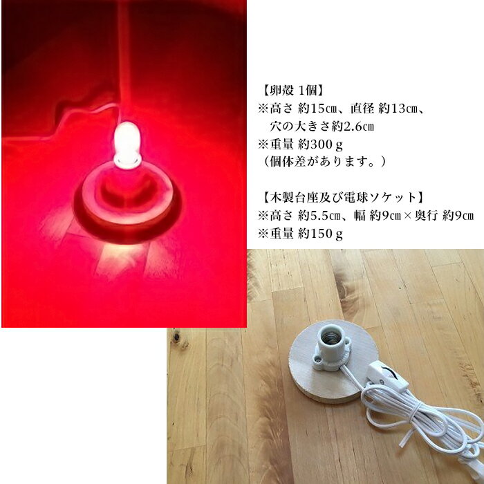 商品詳細 名称 国産オーストリッチエッグランプ(白熱電球赤色)【インテリアに最適!】[0054-1526D] 内容量 ・卵殻 1個 ※高さ 約15cm、直径 約13cm、穴の大きさ約2.6cm ※重量 約300g (個体差があります。